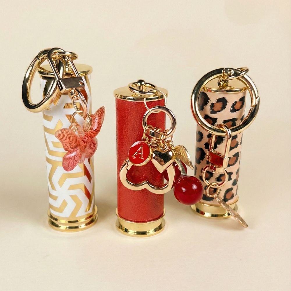 This lipstick packaging features an integrated keychain attachment, designed for "on-the-go" product positioning and handbag accessorization. The mechanism utilizes a standard 12.7mm cup size, ensuring compatibility with high-speed filling lines.
