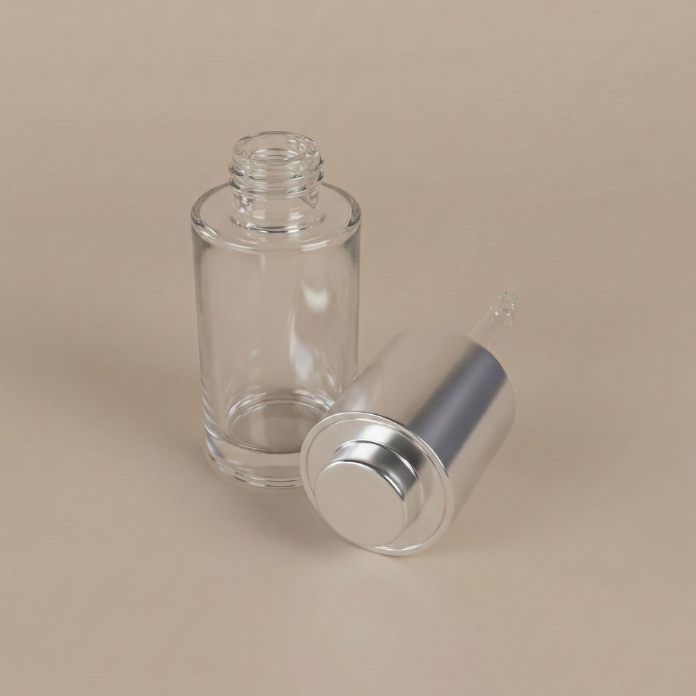 A premium 30ml glass bottle paired with a high-precision auto-loading dropper system. This packaging solution is engineered for high-viscosity serums, oils, and liquid foundations that require exact dosing. The innovative auto-dropper mechanism automatically draws the formula into the pipette when the cap is twisted open, streamlining the application process for the end-user. The thick-walled glass provides excellent chemical compatibility and a weighted, luxury feel.