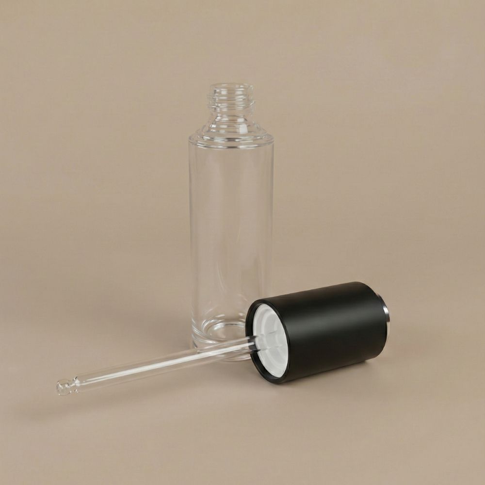 This 30ml Auto-Loading Dropper system is engineered for high-viscosity serums, essences, and premium oils. The bottle features a heavy-wall glass construction for superior formula stability and a weighted, luxury feel. Its primary differentiator is the integrated auto-load actuator: the pipette automatically draws the precise dosage when the cap is unscrewed, ensuring consistent application and a sophisticated dispensing ritual. The sleek, flush-fit collar design provides a seamless transition from cap to bottle, optimizing shelf presence for professional skincare lines.